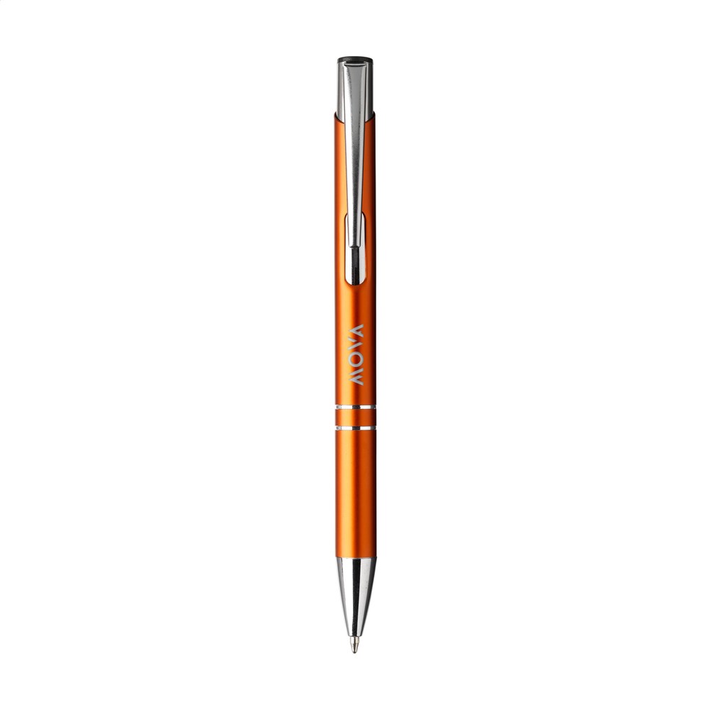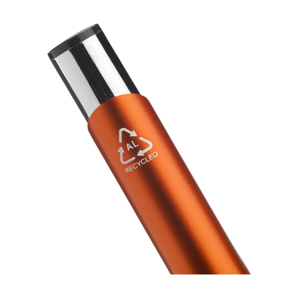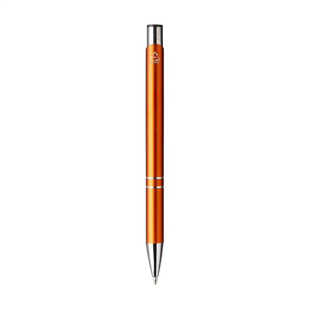 Blauschreibender Kugelschreiber aus recyceltem Aluminium. Der Halter ist mit einer wunderschön glänzenden Oberfläche im Metallic-Look versehen. Mit Metallclip. Durch die Verwendung von recyceltem Aluminium werden bei der Herstellung dieses Produkts weniger neue Rohstoffe verwendet. Das bedeutet weniger Energieverbrauch und weniger Wasserverbrauch.