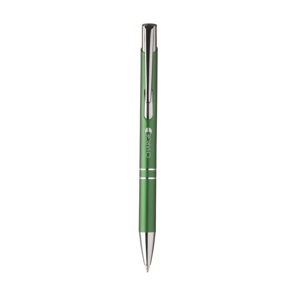 Blauschreibender Kugelschreiber aus recyceltem Aluminium. Der Halter ist mit einer wunderschön glänzenden Oberfläche im Metallic-Look versehen. Mit Metallclip. Durch die Verwendung von recyceltem Aluminium werden bei der Herstellung dieses Produkts weniger neue Rohstoffe verwendet. Das bedeutet weniger Energieverbrauch und weniger Wasserverbrauch.