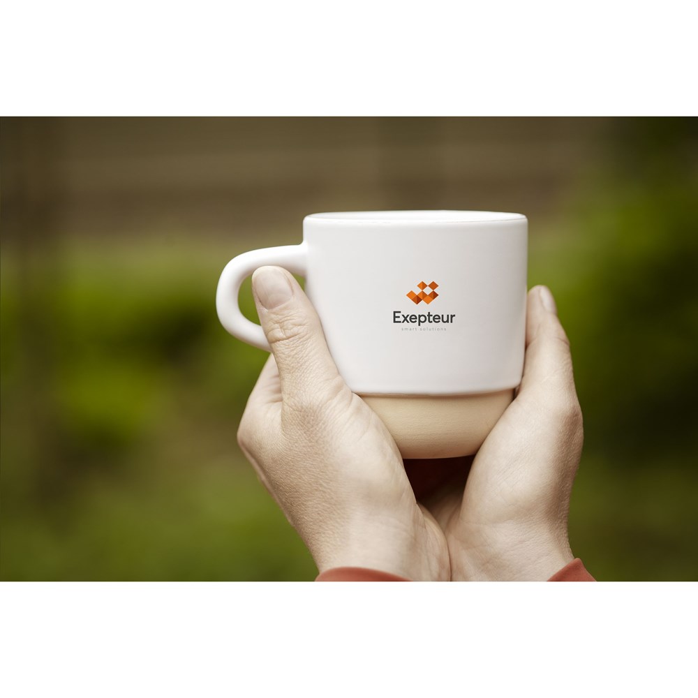 Stapelbarer Becher mit Henkel, aus hochwertiger Keramik und 5% recycelter Keramik. Die Außenseite ist in einem schicken matten Finish gehalten und die Innenseite ist hochglänzend ausgeführt. Der untere Teil des Bechers ist unglasiert und zeigt die natürliche, unbearbeitete Keramik. Natürliche Tonvariationen verleihen diesem Becher seinen einzigartigen Charakter. Spülmaschinengeeignet. Fassungsvermögen: 300 ml. NOTIZ: Der weiße Becher kann nicht mit einer Lasergravur versehen werden, da diese nicht ausreichend sichtbar ist. Recycelte Keramikbecher werden hergestellt, indem Rohstoffe mit Bruchstücken von zerbrochenen oder unbrauchbaren Bechern, die in derselben Fabrik gesammelt wurden, vermischt werden. Die ausgemusterten Komponenten werden zu Pulver zermahlen und dann mit wichtigen Substanzen wie Kaolin und Quarz vermischt, bevor sie zu neuen Keramikprodukten verarbeitet werden. Um eine optimale Qualität zu gewährleisten, besteht das Endprodukt in der Regel zu 5 bis 10% aus recycelter Keramik. Die Verwendung von recycelter Keramik fördert die Kreislaufwirtschaft und reduziert den Bedarf an neuen Rohstoffen.