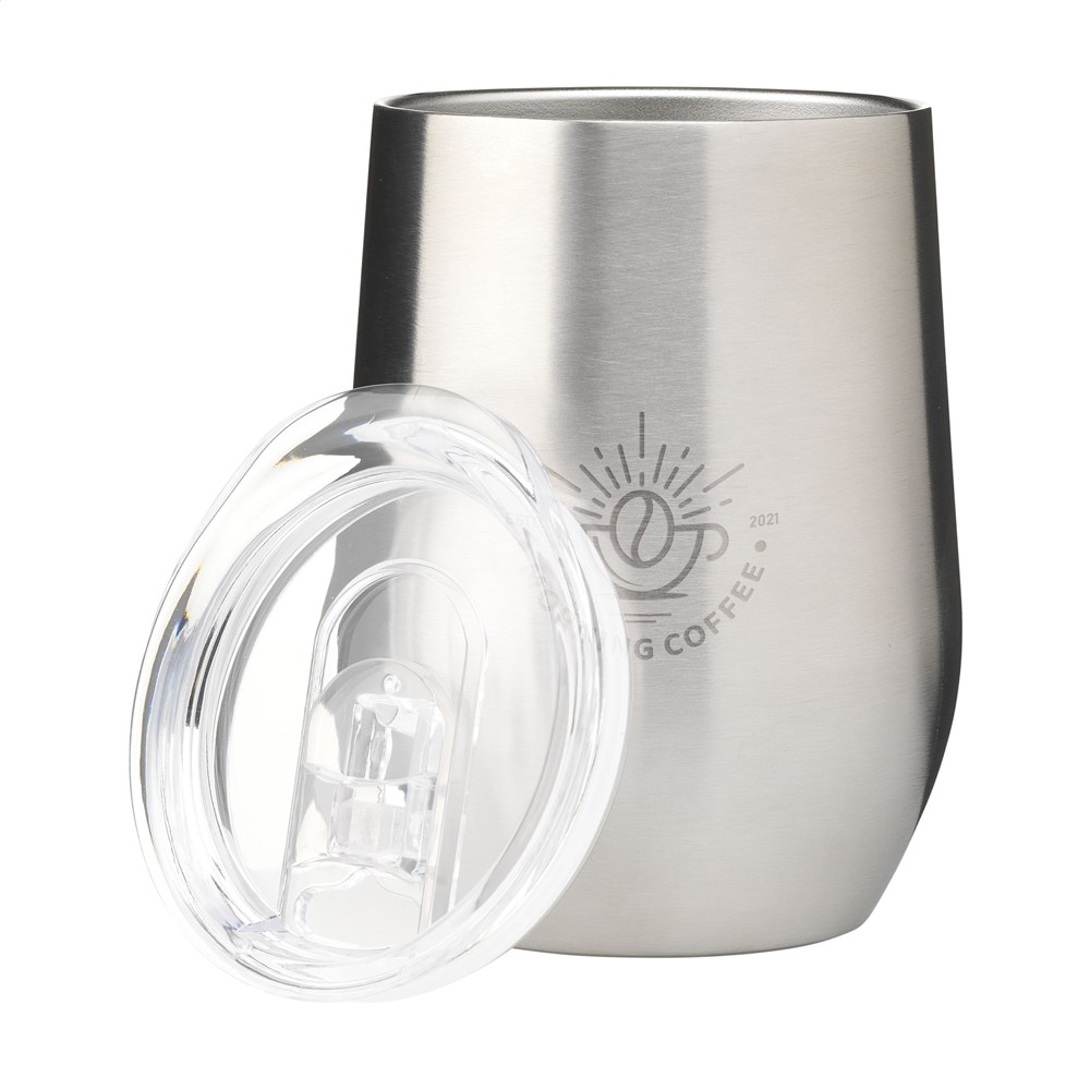Doppelwandiger Trinkbecher. Die Innen- und Außenwände sind aus recyceltem Edelstahl gefertigt. Dadurch bleiben heiße Getränke länger auf der richtigen Temperatur. Durch sein besonders schönes Design und die attraktive matte Oberfläche fällt der Becher sofort auf. Der transparente Aufsteckdeckel aus Kunststoff ist mit einer verschließbaren Trinköffnung versehen. Nicht spülmaschinengeeignet. Fassungsvermögen 350 ml. RCS-zertifiziert. Gesamtes recyceltes Material: 74%. Verpackt pro Stück.