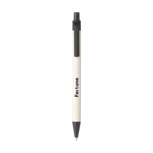 Blauschreibender Kugelschreiber. Der Halter dieses Stifts ist aus recycelten Milchkartons hergestellt. Clip, Druckknopf und Spitze sind aus PLA gefertigt. Das biologisch abbaubare Material PLA wird aus Maisstärke hergestellt, die von Pflanzen produziert wird – natürlich und erneuerbar. Aufgrund der Verwendung von recycelten Materialien können kleine Imperfektionen im Material sichtbar sein. Dies verleiht dem Produkt ein einzigartiges Aussehen.