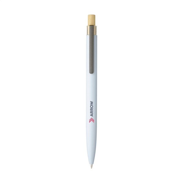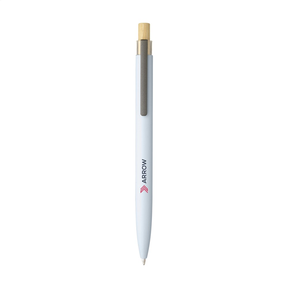 Modischer, blauschreibender Kugelschreiber mit einem Gehäuse aus 100% recyceltem Aluminium mit mattem Finish. Der Druckknopf aus Bambus ist mit einem transparenten Akzent versehen. Das Gehäuse besteht aus einem Stück und ist standardmäßig mit dem Logo 'Recycled Aluminium' bedruckt. GRS-zertifiziert. Durch die Verwendung von recyceltem Aluminium werden bei der Herstellung dieses Produkts weniger neue Rohstoffe verwendet. Das bedeutet weniger Energieverbrauch und weniger Wasserverbrauch.