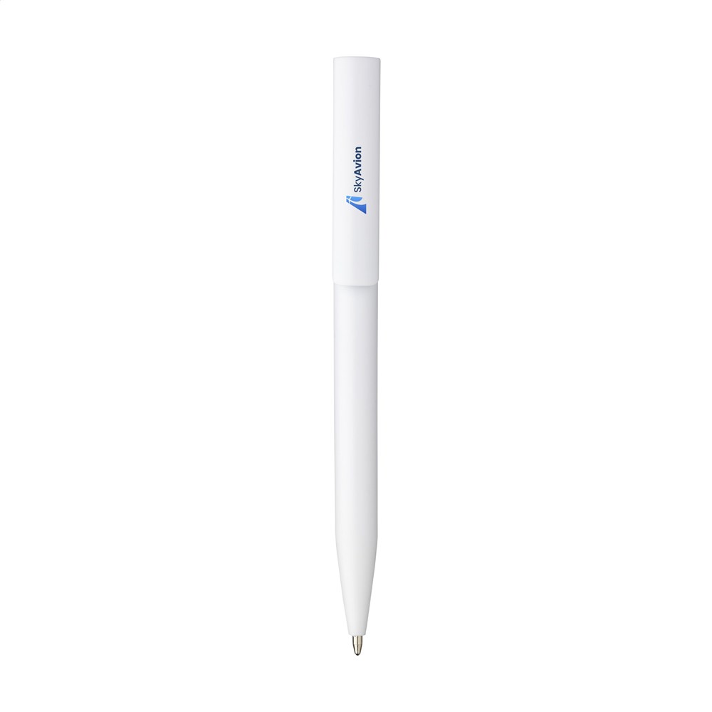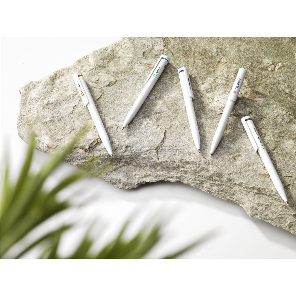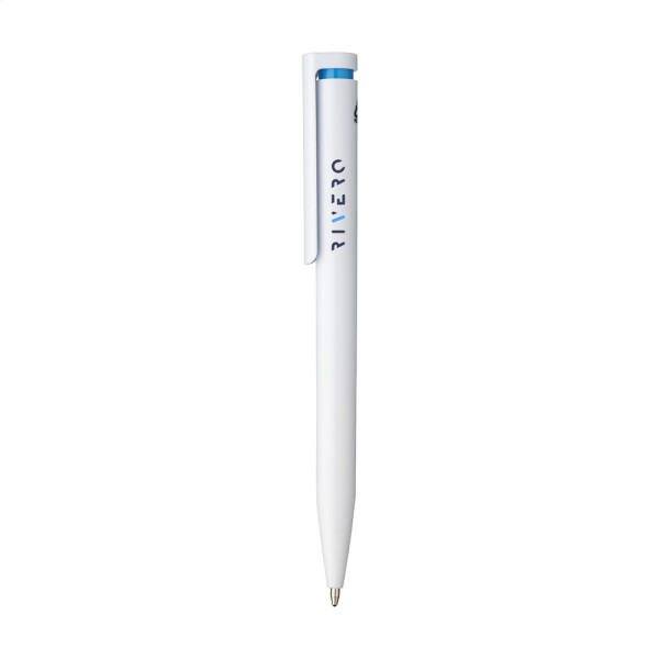 Blauschreibender Kugelschreiber mit einem Gehäuse aus 100% recyceltem ABS. Der Clip/Druckknopf ist mit einem auffälligen farblichen Akzent gestaltet und bietet Platz für einen großzügigen, digitalen Vollfarbaufdruck. GRS-zertifiziert.