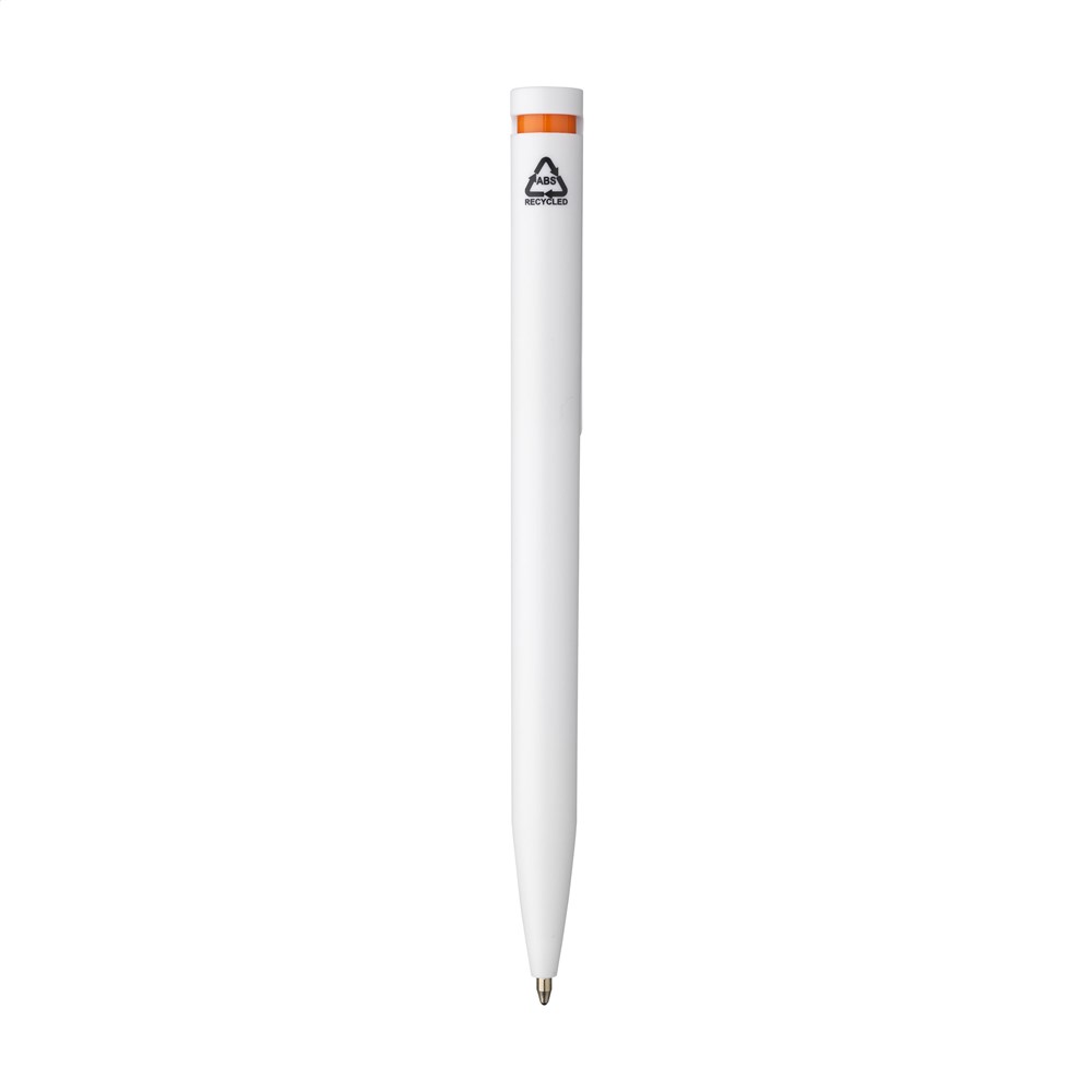 Blauschreibender Kugelschreiber mit einem Gehäuse aus 100% recyceltem ABS. Der Clip/Druckknopf ist mit einem auffälligen farblichen Akzent gestaltet und bietet Platz für einen großzügigen, digitalen Vollfarbaufdruck. GRS-zertifiziert.