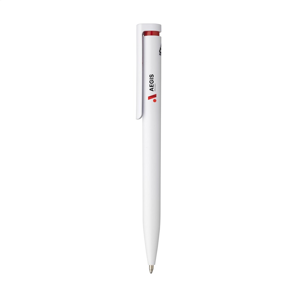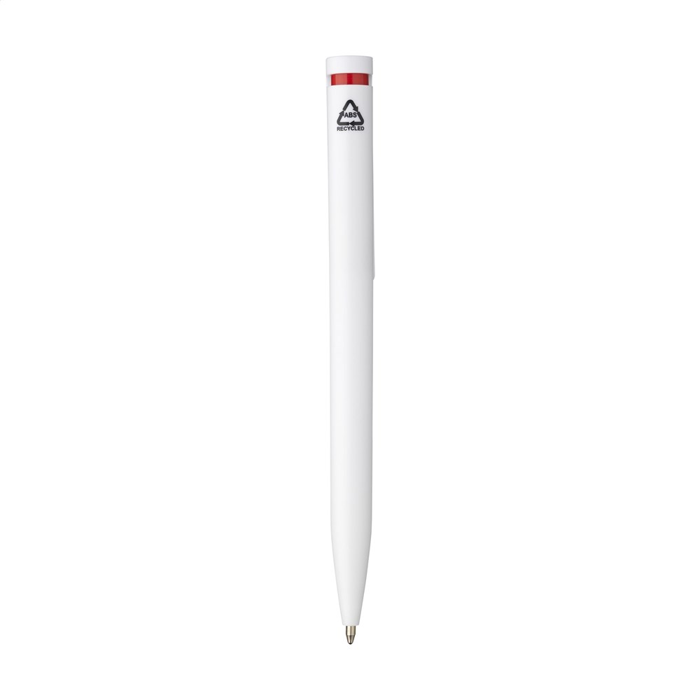 Blauschreibender Kugelschreiber mit einem Gehäuse aus 100% recyceltem ABS. Der Clip/Druckknopf ist mit einem auffälligen farblichen Akzent gestaltet und bietet Platz für einen großzügigen, digitalen Vollfarbaufdruck. GRS-zertifiziert.