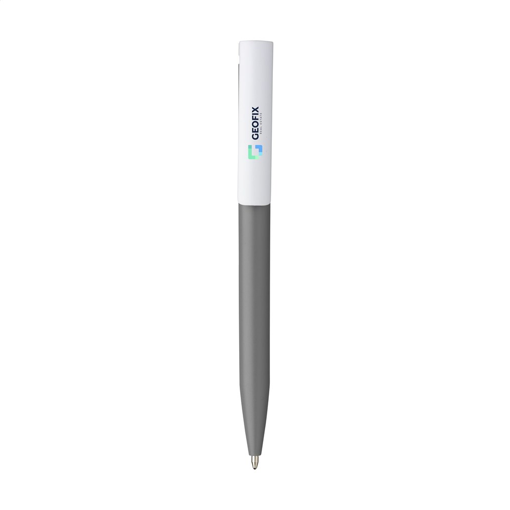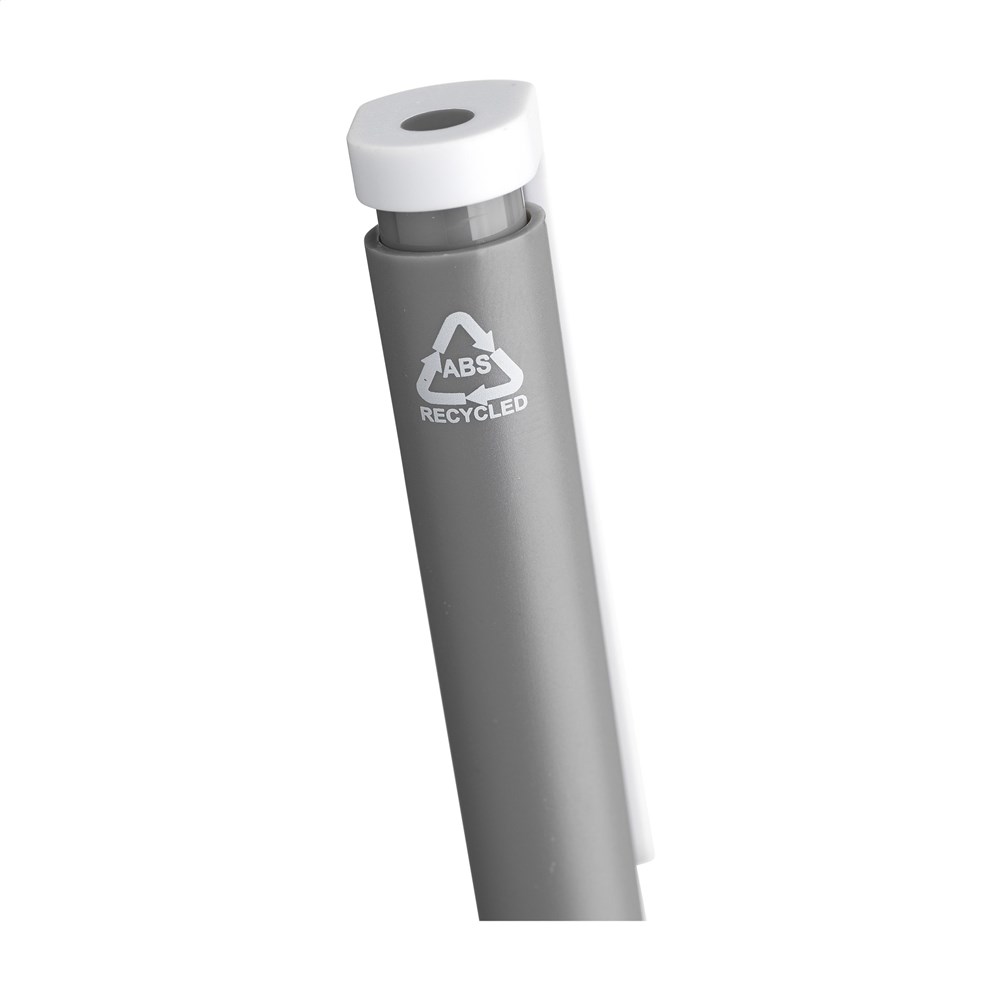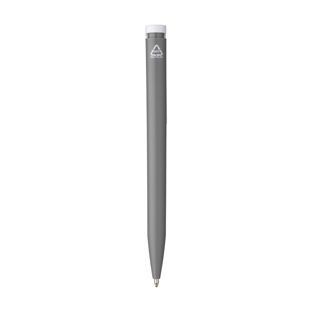 Blauschreibender Kugelschreiber mit einem Gehäuse aus 100% recyceltem ABS. Der Clip/Druckknopf ist mit einem auffälligen farblichen Akzent gestaltet und bietet Platz für einen großzügigen, digitalen Vollfarbaufdruck. GRS-zertifiziert.