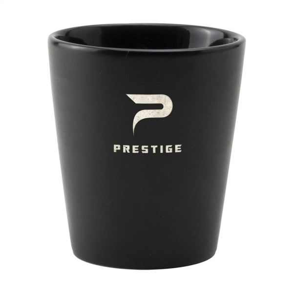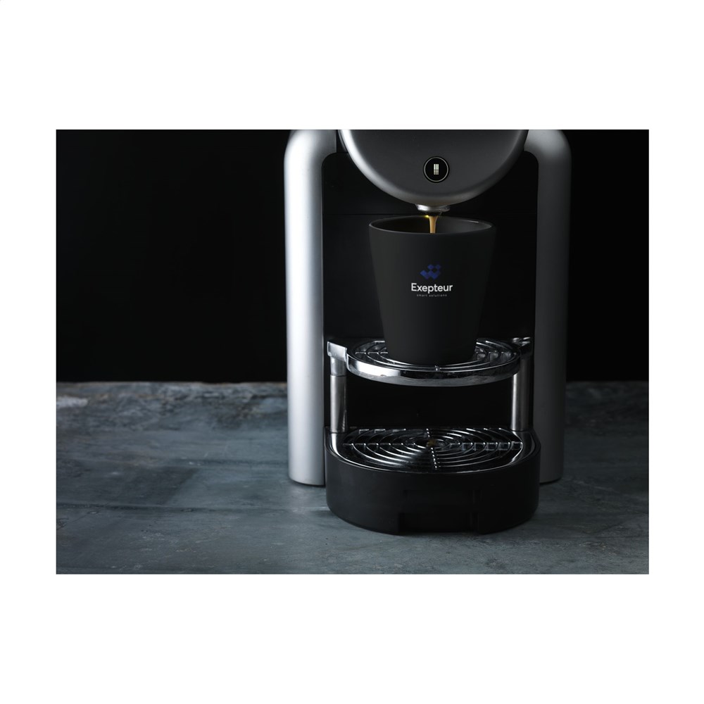 Trendiger Becher ohne Henkel. Aus hochwertiger Keramik. Mit matter, farbiger Außenseite und kontrastierender weißer Hochglanz-Innenseite. Geeignet für alle Kaffeemaschinen. Fassungsvermögen 190 ml. Spülmaschinenfest. Der Druck ist spülmaschinengeprüft und zertifiziert: EN 12875-2.