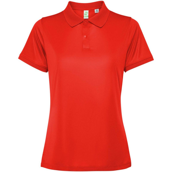 Kurzärmeliges, tailliertes Poloshirt für Damen. Verstärkte und verdeckte Nähte am Innenkragen. 1×1-Rippstrick an Bündchen und Kragen. Seitennähte. Knopfleiste mit 3 Knöpfen und Seitenschlitze.