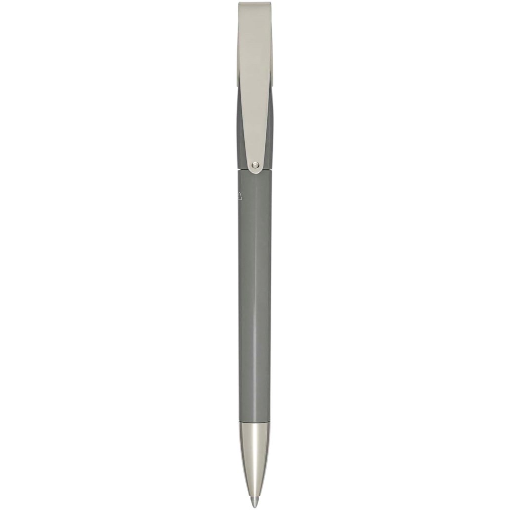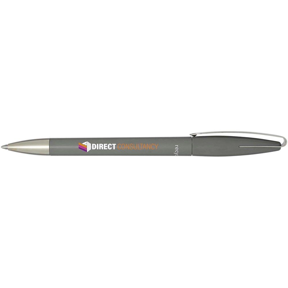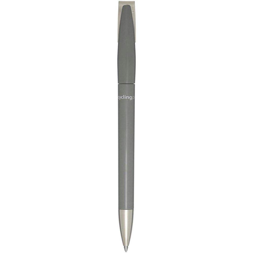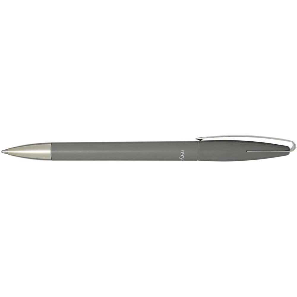 Kugelschreiber mit Schaft aus recyceltem Kunststoff, Edelstahlspitze und -clip. Tintenfarbe: Blau. Schreiblänge: 3000 Meter. Strichstärke: 1,00 mm. Hergestellt in Deutschland.