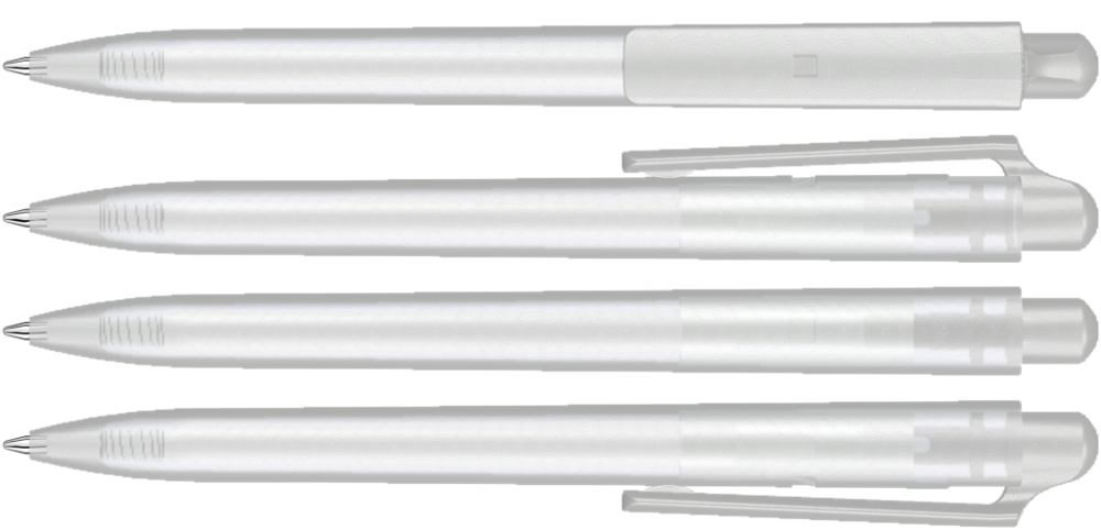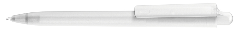 Druckkugelschreiber mit transparent gefrostetem Gehäuse und Clipdrücker.