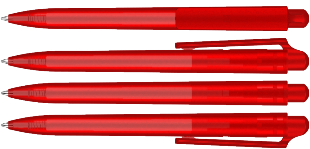 Druckkugelschreiber mit transparent gefrostetem Gehäuse und Clipdrücker.