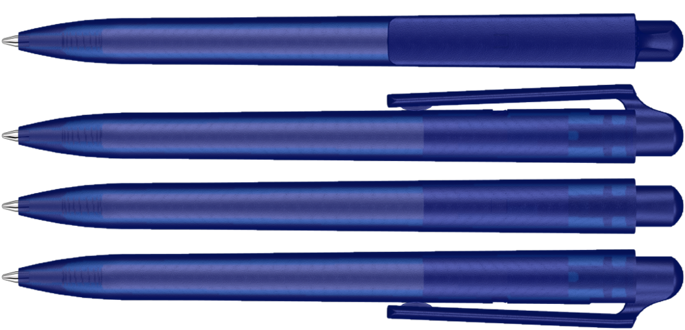 Druckkugelschreiber mit transparent gefrostetem Gehäuse und Clipdrücker.