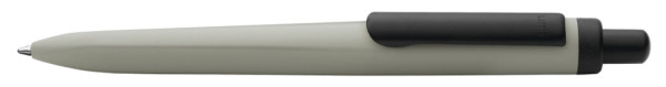 Metall-Druckkugelschreiber mit gemetrisch wechselnder Schaftform, die sich zur Schreibspitze hin in eine prägnante Dreikantgeometrie verjüngt. Aluminiumgehäuse matt lackiert, Clip und Drücker in schwarz matt.
