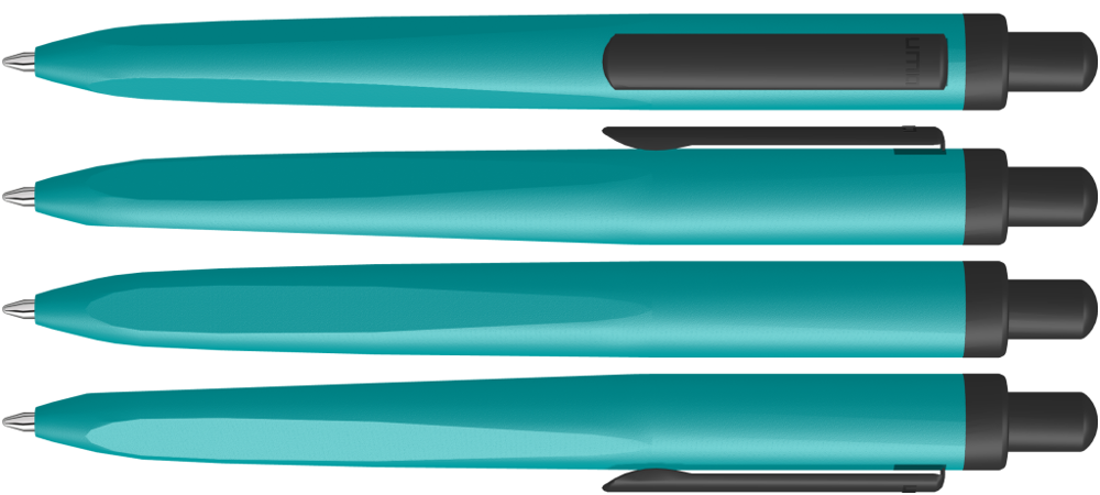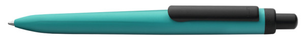 Metall-Druckkugelschreiber mit gemetrisch wechselnder Schaftform, die sich zur Schreibspitze hin in eine prägnante Dreikantgeometrie verjüngt. Aluminiumgehäuse matt lackiert, Clip und Drücker in schwarz matt.