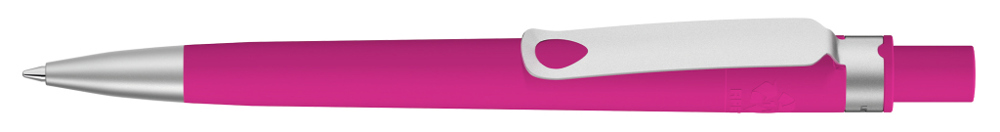 Druckkugelschreiber mit gummiertem Gehäuse aus recyceltem PET-Material mit matt gedecktem Gehäuse. Metallclip und Metallspitze matt verchromt.