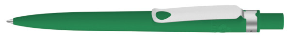 Druckkugelschreiber mit gummiertem Gehäuse aus recyceltem PET-Material mit Metallclip matt verchromt.