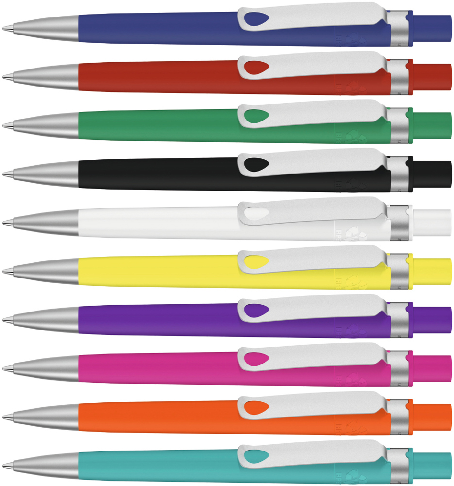 Druckkugelschreiber aus recyceltem PET-Material mit matt gedecktem Gehäuse. Metallclip und Metallspitze matt verchromt.