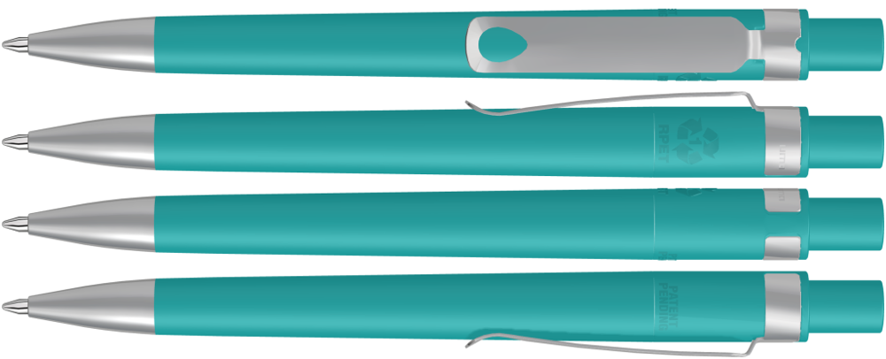 Druckkugelschreiber aus recyceltem PET-Material mit matt gedecktem Gehäuse. Metallclip und Metallspitze matt verchromt.