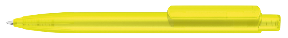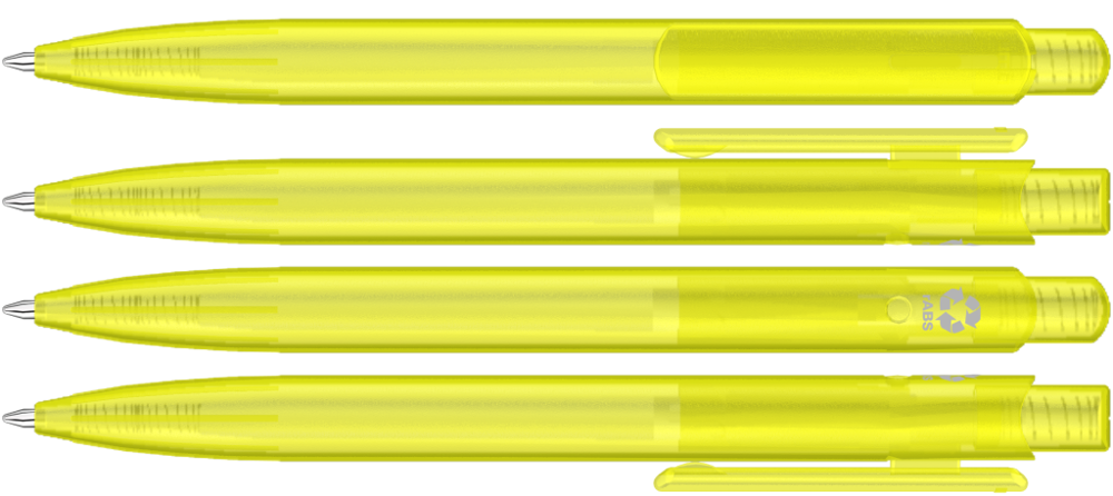 Druckkugelscheiber mit transparent gefrostetem Gehäuse, Clip und Drücker aus recyceltem ABS Kunststoff. Eingelassene Griffzone.