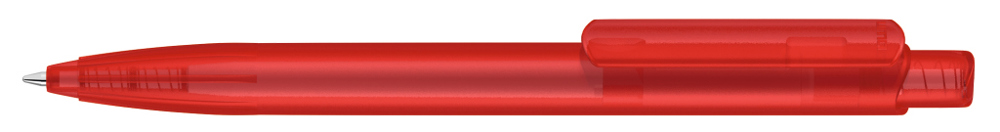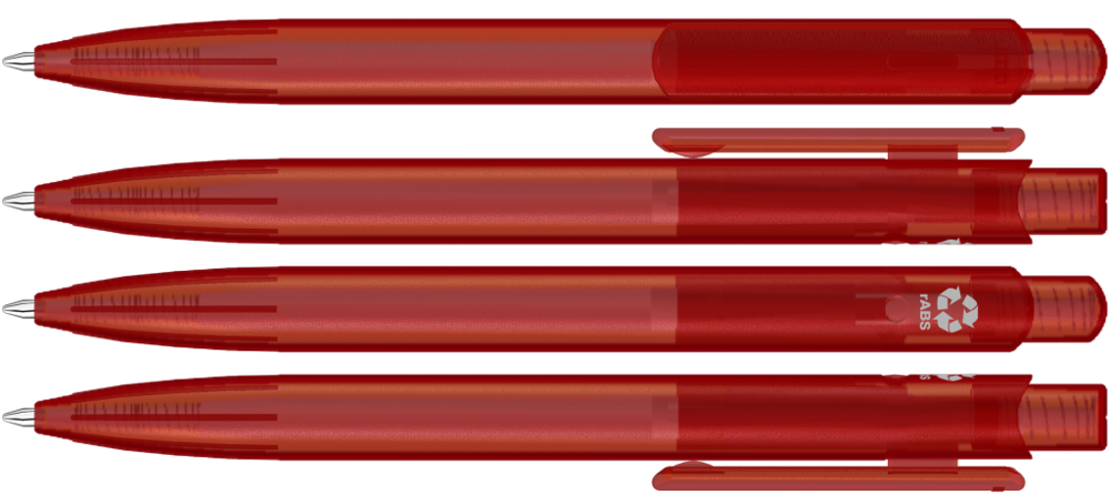 Druckkugelscheiber mit transparent gefrostetem Gehäuse, Clip und Drücker aus recyceltem ABS Kunststoff. Eingelassene Griffzone.