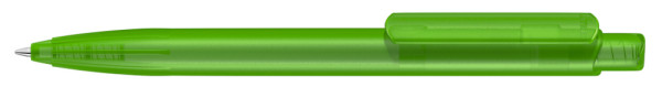 Druckkugelscheiber mit transparent gefrostetem Gehäuse, Clip und Drücker aus recyceltem ABS Kunststoff. Eingelassene Griffzone.