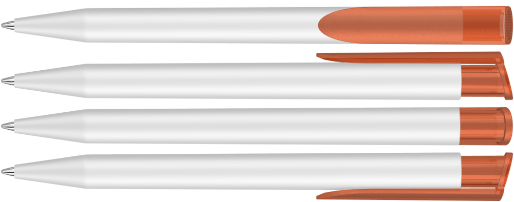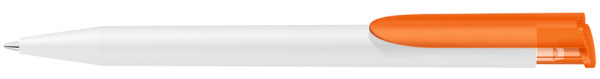 Druckkugelschreiber mit gedeckt mattem Gehäuse in weiß und farbig transparent gefrostetem Clipdrücker.