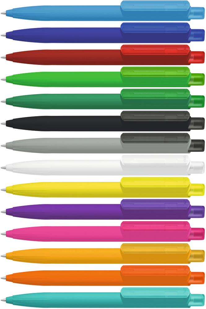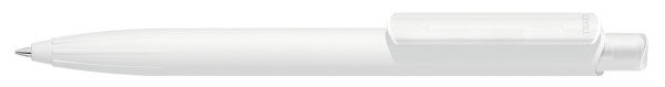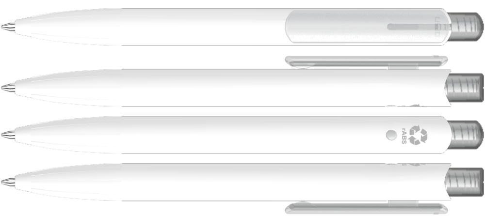 Druckkugelscheiber mit gummiertem Gehäuse aus recyceltem ABS-Kunststoff mit transparent gefrostetem Clip und Drücker. Eingelassene Griffzone.