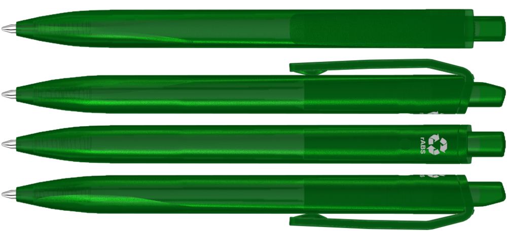 Druckkugelscheiber mit transparent gefrostetem Gehäuse, Clip und Drücker aus recyceltem ABS Kunststoff. Griffzone ergonomisch geformt.