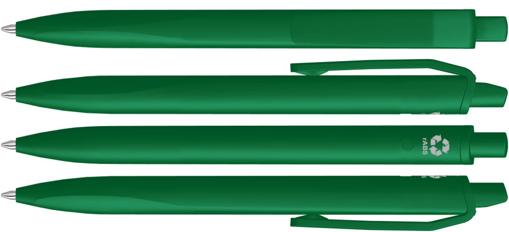 Druckkugelscheiber mit gedeckt mattem Gehäuse, Clip und Drücker aus recyceltem ABS-Kunststoff. Griffzone ergonomisch geformt.