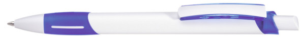 Druckkugelschreiber mit gedeckt weißem Gehäuse, transparent gefrosteter Gummigriffzone, Zierring und Clipschale.