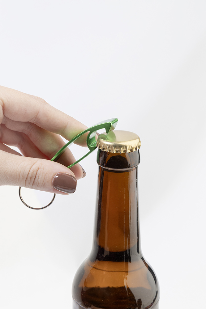 Flaschenöffner aus recyceltem Aluminium mit Schlüsselring aus Metall.
