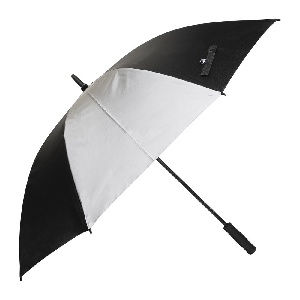 Manueller und großer windproof Regenschirm mit 8 Segmenten, 4 davon aus reflektierend. Gestell und Schaft aus Fiberglas, mit EVA-Griff. Material: 190T RPET-Pongee. Mit Label RPET.