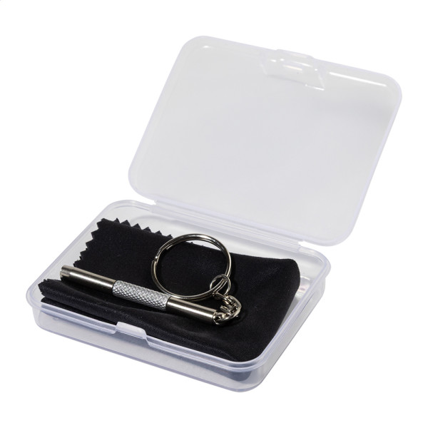 Kompaktes Brillenreparaturset in transparenter PP-Box. Enthält ein Reinigungstuch aus 100 % RPET-Mikrofaser (220 g/m²) und einen Mini-Schraubendreher mit Schlüsselring. Tuchgröße: 18x15 cm.