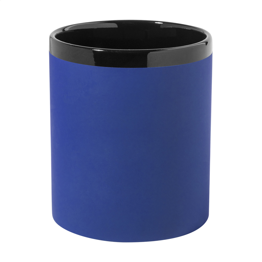 Keramiktasse mit gummierter Soft-Touch-Oberfläche und schwarzer Innneseite und Trinkrand. Mit Spezialbeschichtung für Gravuren (Gravurfarbe abgestimmt mit der Innenfarbe). Füllmenge: 300 ml. Einzeln in Kraftpapierbox.