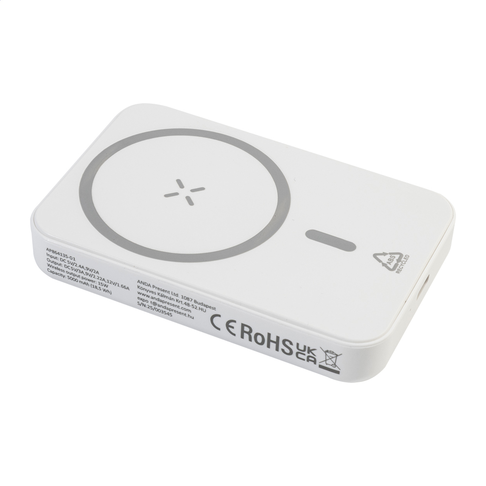 Powerbank aus recyceltem ABS mit 5000 mAh Akku, eigebautem Wireless-Fast-Charger (15W), USB-C Eingangs- und Ladeport. Inkl. selbstklebendem Metallring um die magnetische Funktion bei jeglichem Gerät mit Wireless-Charge-Option zu nutzen. Kompatibel mit iPhone® 12 oder neuer. Inkl. USB-Ladekabel.