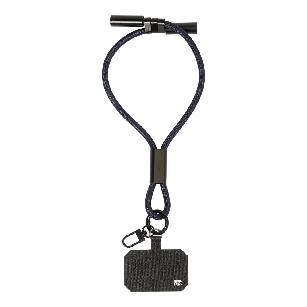 Handyhalter-Handgelenkband mit Handyeinleger, Karabiner und integriertem USB-C zu USB-C Ladekabel mit versteckten Steckern. Unterstütz 60W PD Fast-Charging und Datentransfer.