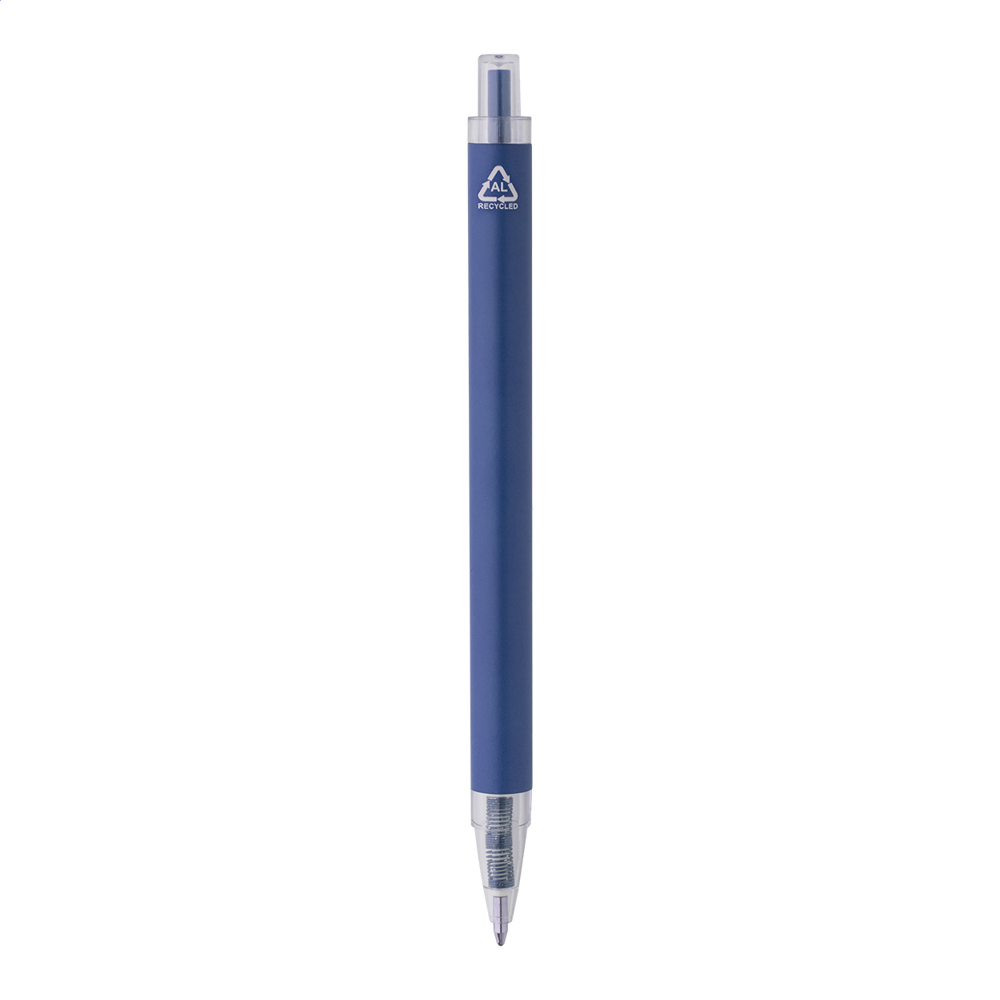 Kugelschreiber aus recyceltem Aluminium mit mattem Schaft und Elementen aus transparentem RPET. Blauschreibend.
