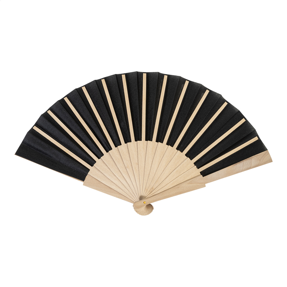 Handfächer aus RPET-Polyester mit Holzspeichen.