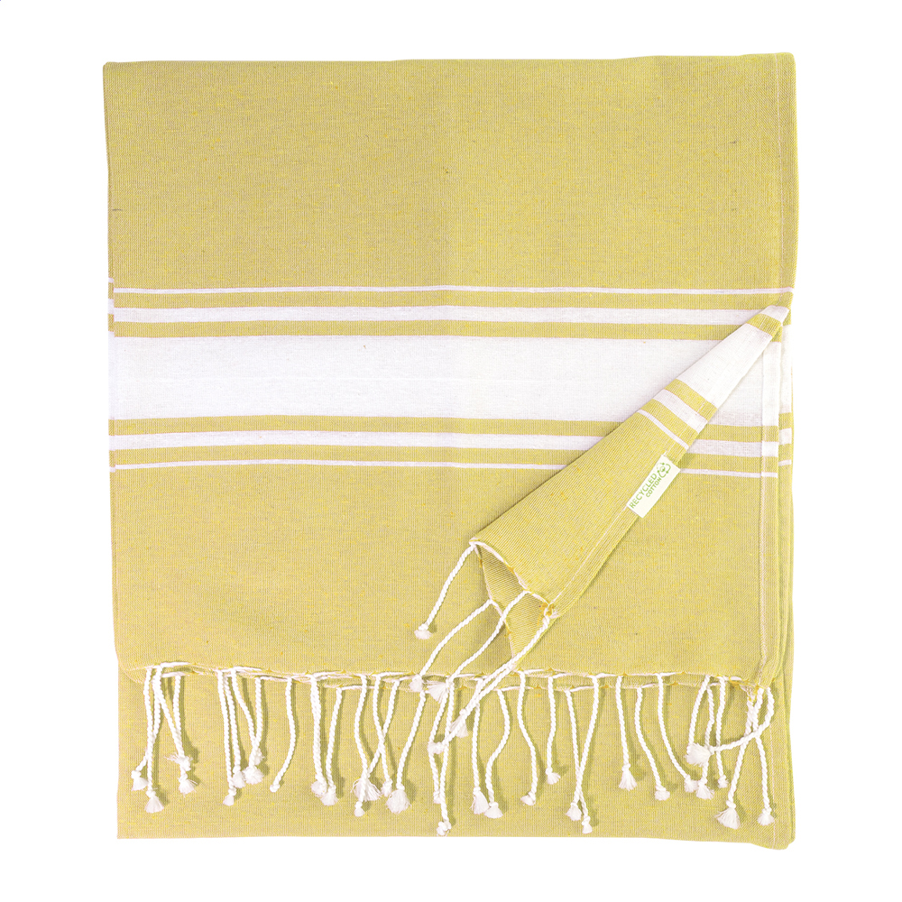 Zweifarbiges Pareo-Strandtuch. Material: 70 % recycelter Baumwolle und 30 % RPET-Polyester (180 g/m²).