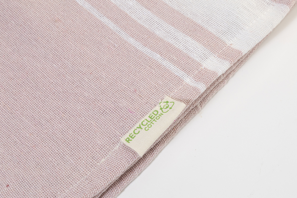 Zweifarbiges Pareo-Strandtuch. Material: 70 % recycelter Baumwolle und 30 % RPET-Polyester (180 g/m²).