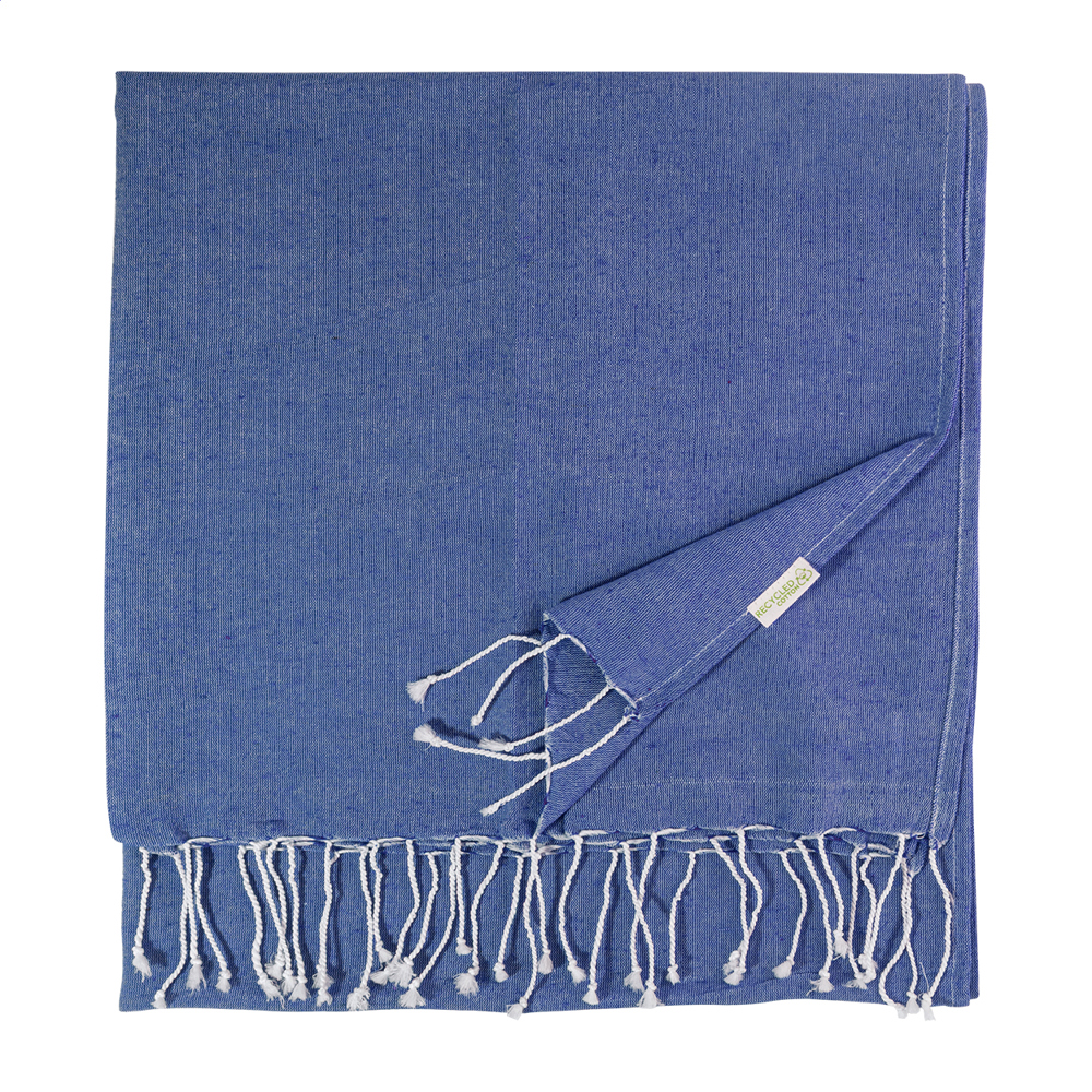 Pareo-Strandtuch. Material: 70 % recycelter Baumwolle und 30 % RPET-Polyester (180 g/m²).