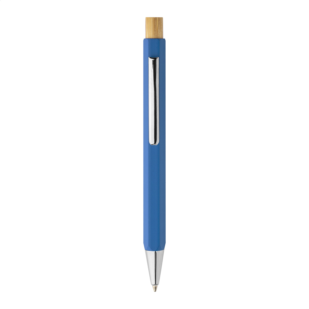 Sechseckiger Kugelschreiber aus recyceltem Aluminium mit Drücker aus Bambus und verchromten Elementen. Blauschreibend.