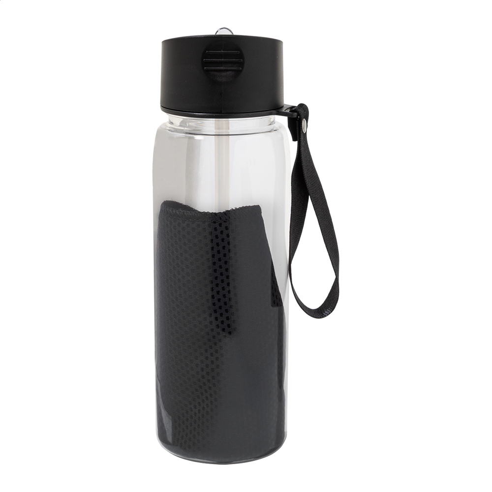 Kühlendes Sporthandtuch aus RPET Polyester in Trinkflasche aus RPET mit Flip-Top-Trinkdeckel aus PP mit integriertem Trinkhalm und Trageschlaufe. Füllmenge: 800 ml. BPA-frei. Nicht geeignet für kohlensäurehaltige Getränke. Handtuchgröße: 30 x 80 cm.