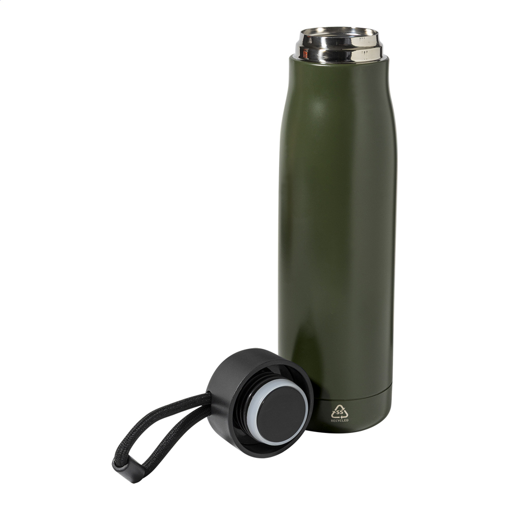 Doppelwandige, vakuumisolierte Trinkflasche aus recyceltem Edelstahl mit Deckel aus PP mit Kordeltrageschleife. Füllmenge: 500 ml.