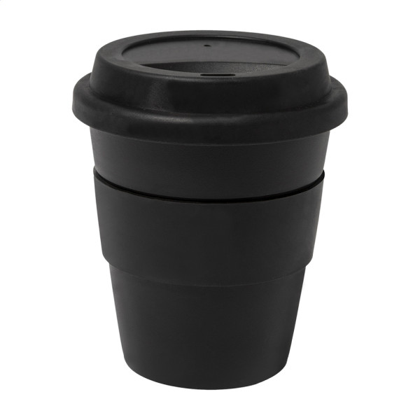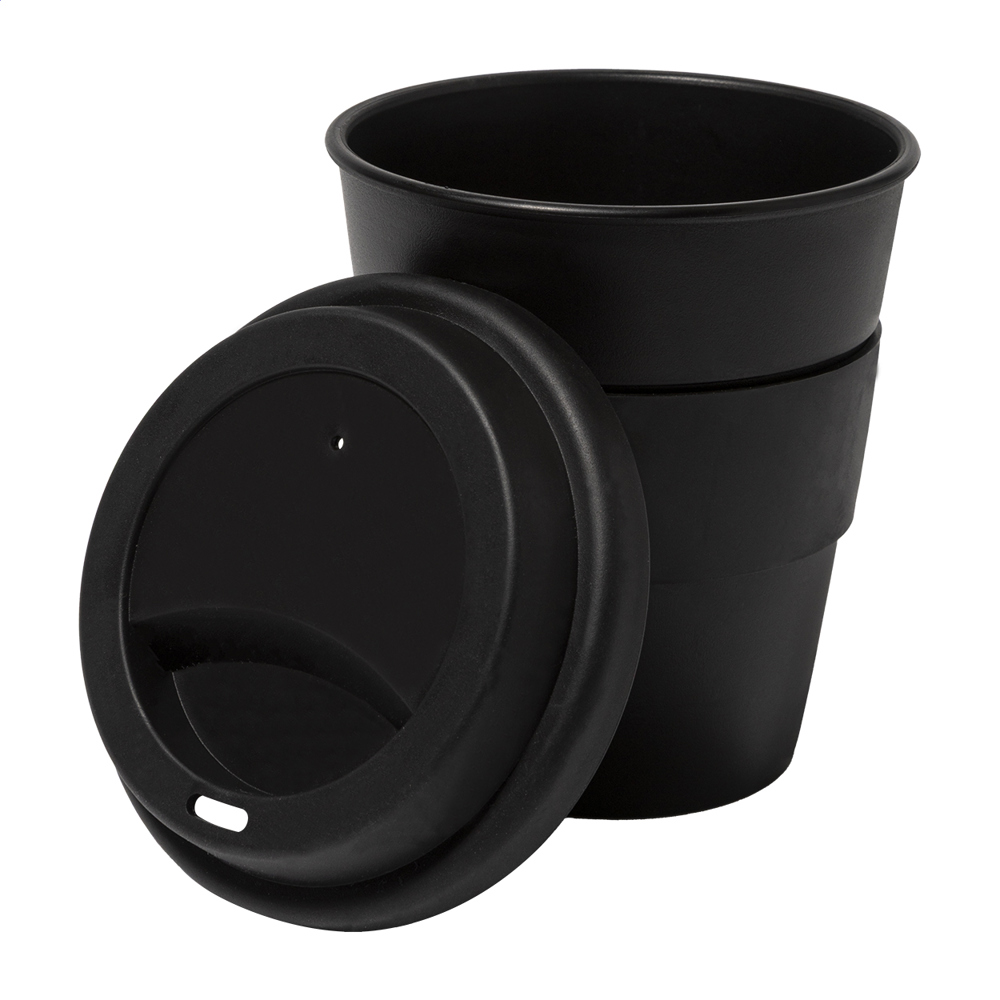 Einwandiger Reisebecher aus PP mit Trinkdeckel und Ring aus TPE. Füllmenge: 350 ml.
