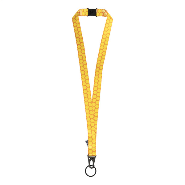 Individuelles RPET-Lanyard mit schwarzem Metallkarabiner im Militärstil, Schlüsselring und Panikverschluss. Der Preis ist inkl. beidseitigem Sublimationsdruck. Mindestmenge: 100 Stk.