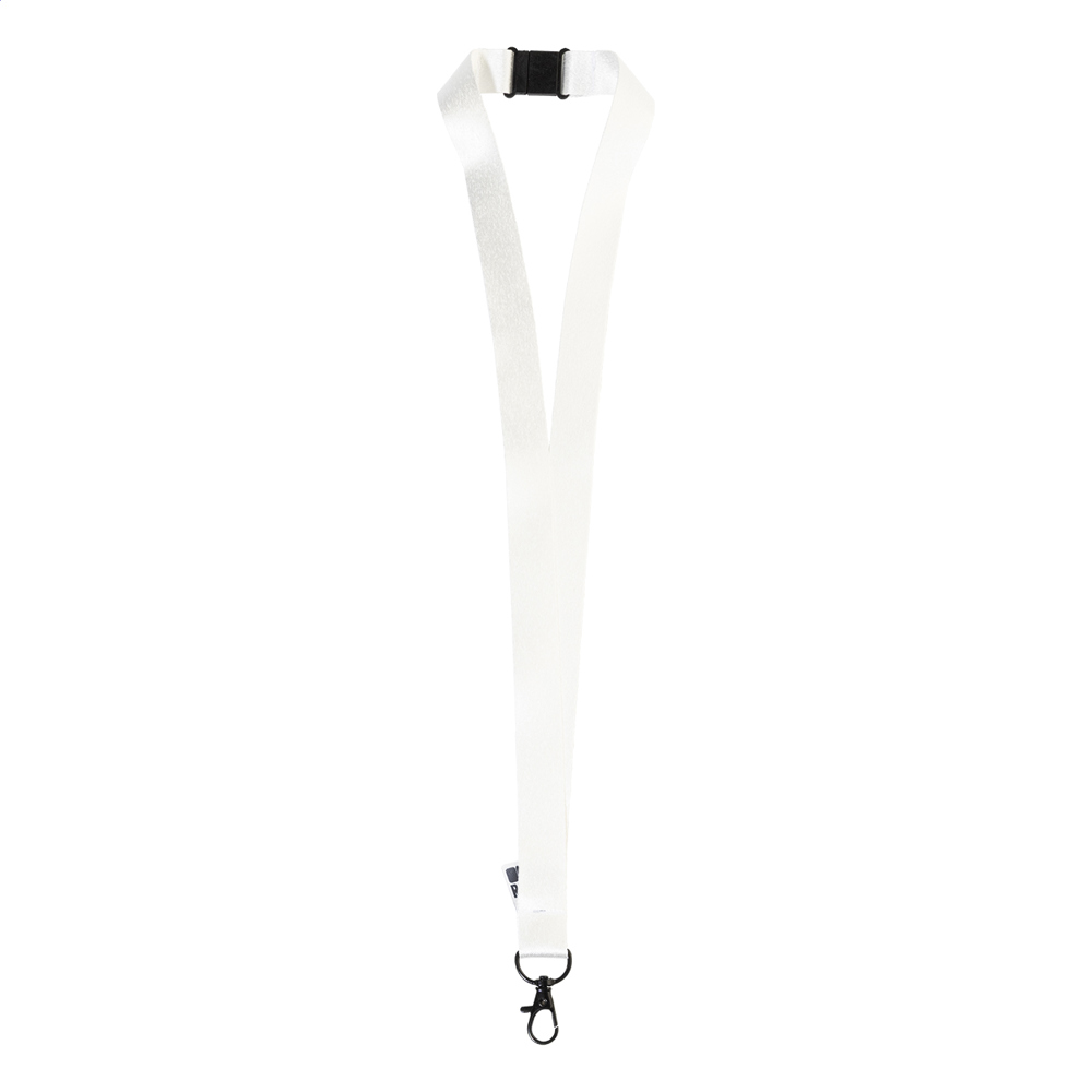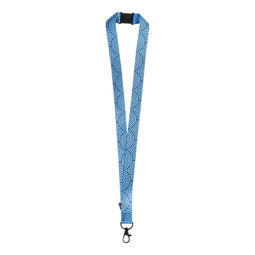 Individuelles Lanyard aus RPET mit farbigem Metallkarabiner und Panikverschluss. Der Preis ist inkl. beidseitigem Sublimationsdruck. Mindestmenge: 100 Stk.