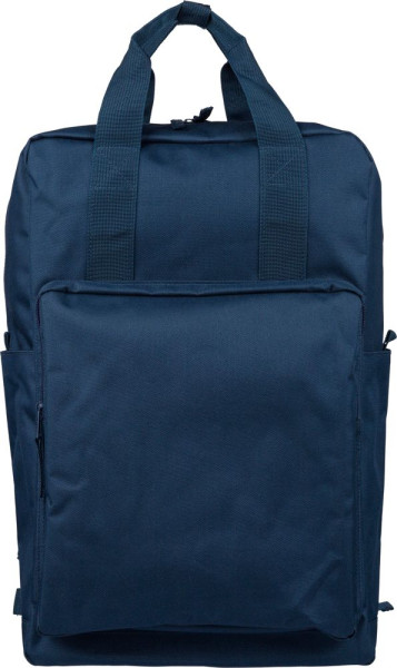 Rucksack aus recyceltem 900D-Polyester mit 210D-Futter und rPET-Etikett an der Seite. Mit großem Hauptfach mit Reißverschluss und 16-Zoll-Laptopfach, kleinerem Frontfach mit Reißverschluss, zwei Seitentaschen und Trolley-Gurt. Mit Tragegriffen mit Knopfverschluss und verstellbaren, belüfteten Schultergurten.