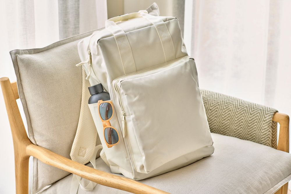Rucksack aus recyceltem 900D-Polyester mit 210D-Futter und rPET-Etikett an der Seite. Mit großem Hauptfach mit Reißverschluss und 16-Zoll-Laptopfach, kleinerem Frontfach mit Reißverschluss, zwei Seitentaschen und Trolley-Gurt. Mit Tragegriffen mit Knopfverschluss und verstellbaren, belüfteten Schultergurten.