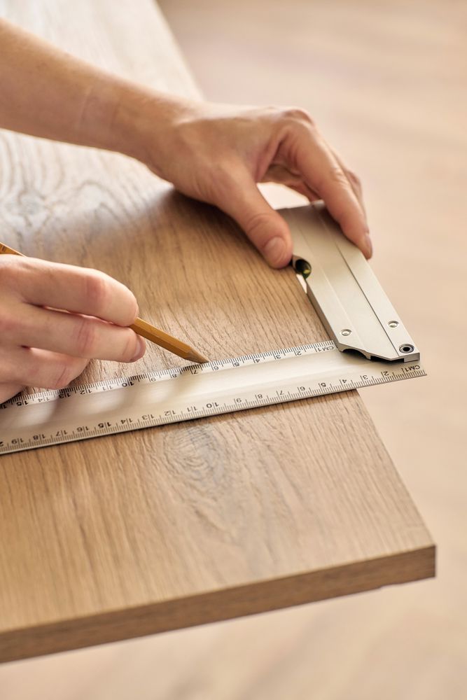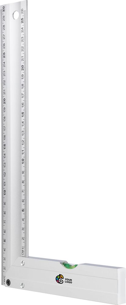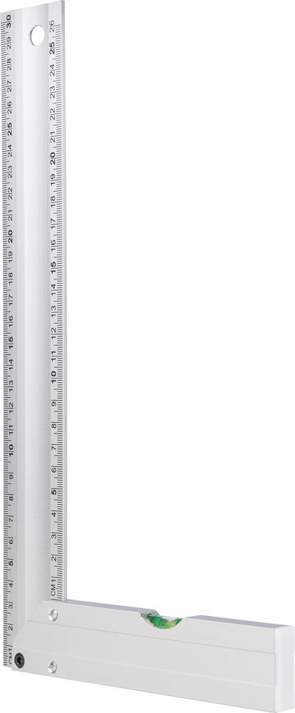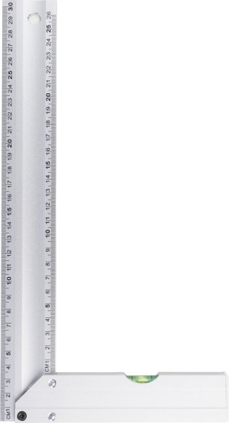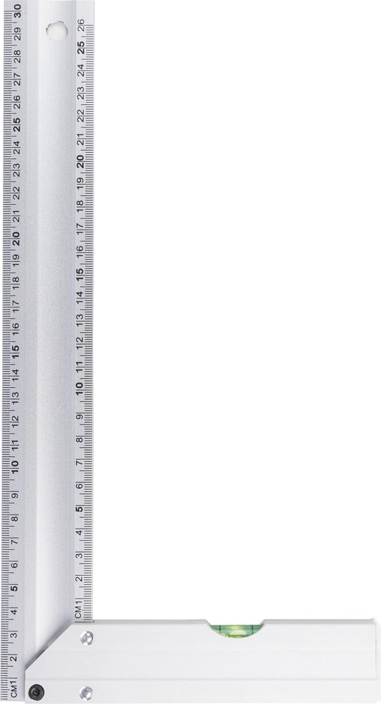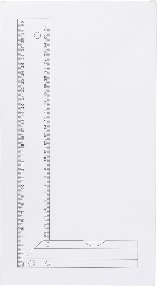 Aluminium-Dreieck mit integrierter Wasserwaage. Es ist 30 cm lang und verfügt über eine deutliche Zentimeteranzeige. Dank des praktischen Designs eignet es sich perfekt für präzises Messen und Nivellieren. Es ist einzeln verpackt in einem braunen Karton mit Abbildung.